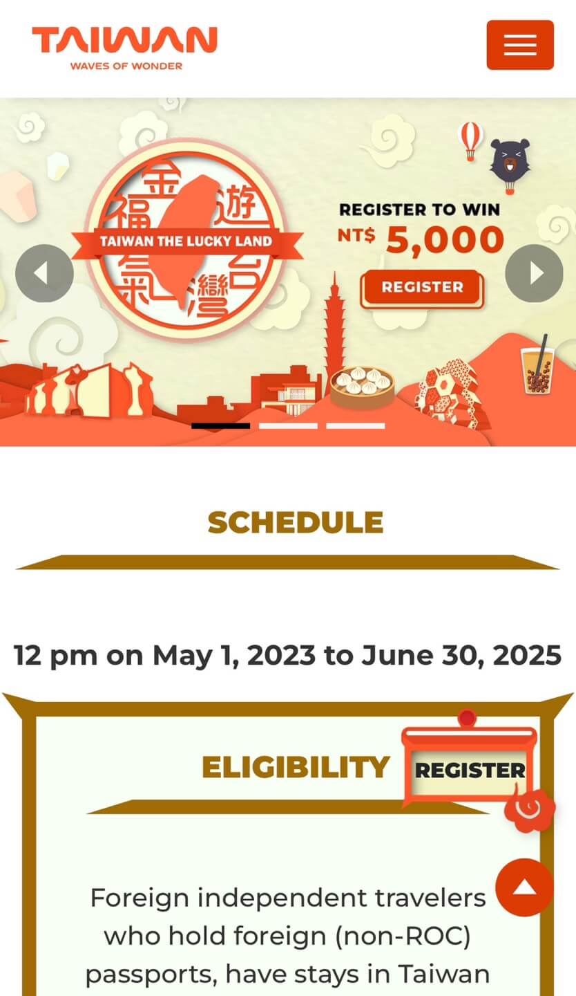 - 항공권에 기재된 대만 도착 1~7일 전까지 공식 홈페이지에서 대만 여행지원금 럭키드로우 사전 등록을 합니다.