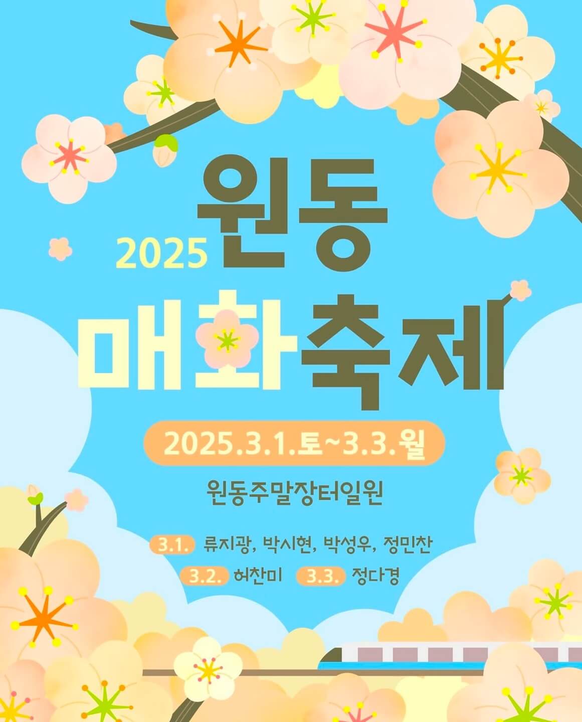 1. 원동 매화축제 기간 : 2025년 3월 1일(일) ~ 3월 3일(월)